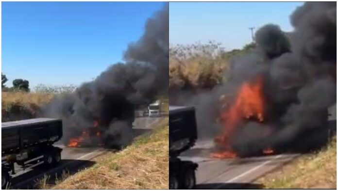 Jaciara (MT) – Uma carreta que transportava enxofre pegou fogo na tarde desta quarta-feira (24) no km 279 da BR-364, em Jaciara. O fogo começou após uma colisão traseira entre duas carretas.