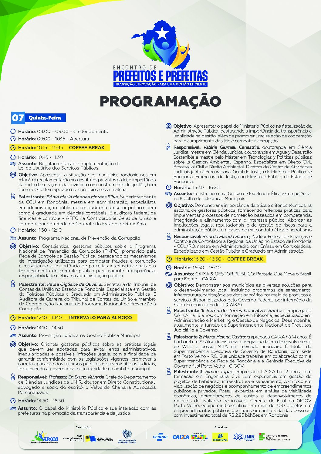A programação do encontro inclui palestras, painéis temáticos e debates interativos que irão explorar temas essenciais para a administração pública. A presença de especialistas enriquecerá as discussões, proporcionando insights para a melhoria das políticas públicas.