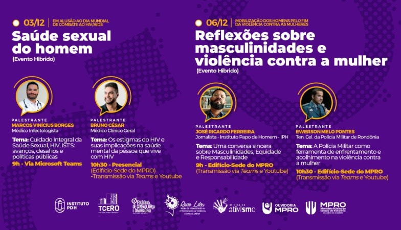 Já no dia 6, as palestras serão voltadas à mobilização dos homens pelo fim da violência contra as mulheres, com as temáticas “Uma conversa sincera sobre Masculinidades, Equidade e Responsabilidade”, com o jornalista do Instituto Papo de Homem (IPH) José Ricardo Ferreira, e “A Polícia Militar como ferramenta de enfrentamento e acolhimento na violência contra a mulher”, ministrada pelo tenente-coronel da Polícia Militar do Estado de Rondônia Ewerson Melo Pontes.