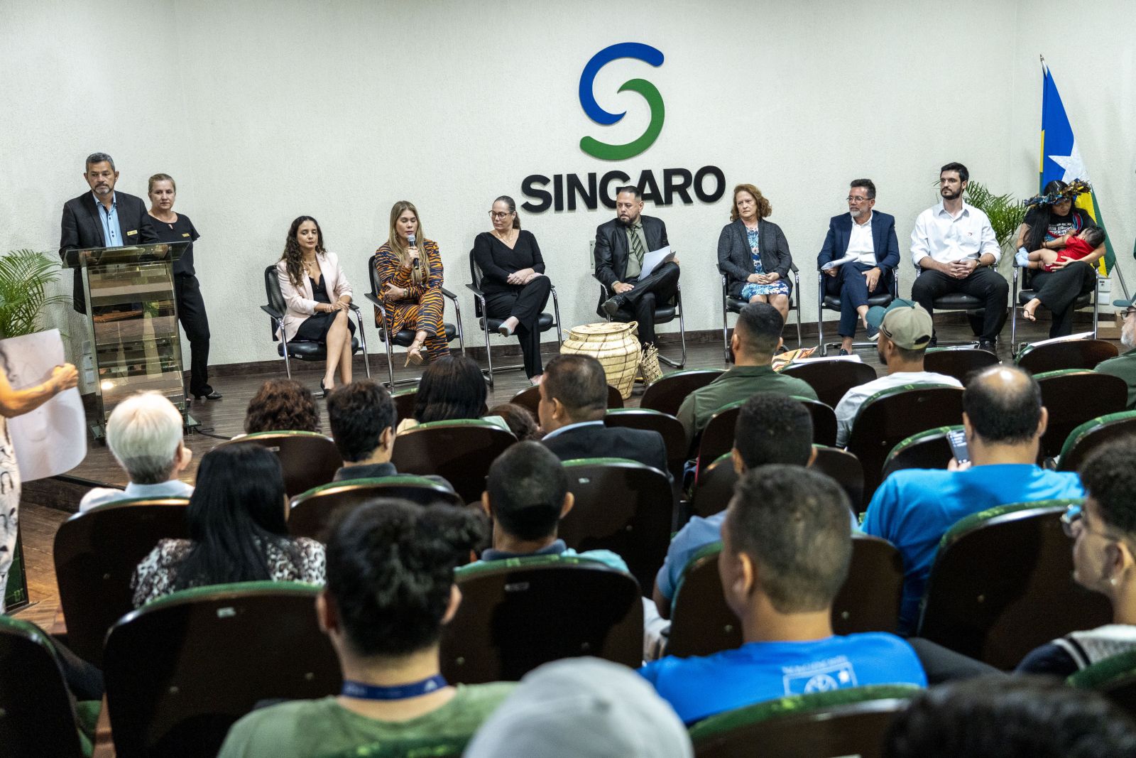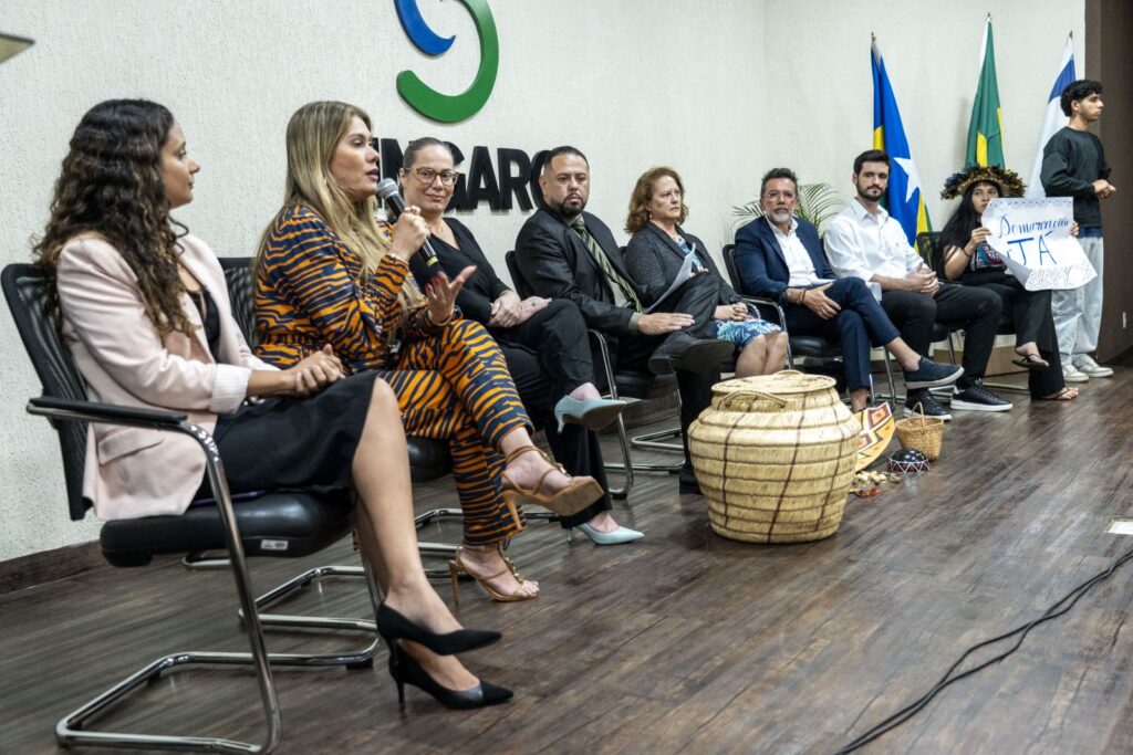 Compuseram também a mesa, durante o ato solene de abertura, a juíza auxiliar da presidência do Comitê Gestor Plano de Sustentabilidade do Tribunal de Justiça de Rondônia (TJ/TO) Karina Miguel Sobral, a assessora de Sustentabilidade e Acessibilidade do Tribunal Regional Eleitoral (TRE/RO), Solange Mendes Garcia, a Defensora Pública do estado, Késia Abrantes, membro da comissão de Meio Ambiente da Ordem dos Advogados (OAB/RO), Isadora Andrade, diretor do Sindicato do Comércio Atacadista de Rondônia, Alyson Dheep Oliveira Rover, o secretário de Meio Ambiente de Itaguaí (RJ) e vice-presidente da Associação Nacional de Municípios e Meio Ambiente (Anamma), Antônio Marcos Barreto, a coordenadora do movimento de Juventude Indígena de Rondônia, Txai Suruí e o presidente da Agência de Desenvolvimento de Porto Velho (DPVH), Leandro Dill.