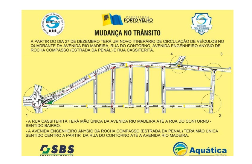 A partir da meia noite de quinta para sexta-feira, dia 27 de dezembro, Porto Velho contará com um novo sentido de circulação de veículos no quadrante da avenida Rio Madeira, rua do Contorno, avenida Engenheiro Anysio da Rocha Compasso (Estrada da Penal) e rua Cassiterita, de acordo com a Secretaria Municipal de Trânsito, Mobilidade e Transportes (Semtran).