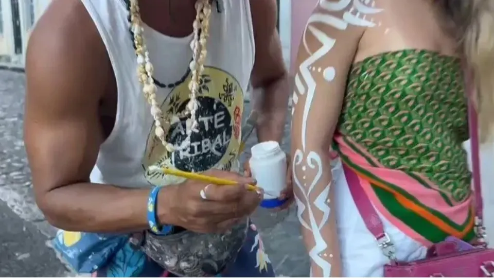 Esse tipo de pintura corporal é característica da banda Timbalada e associada a uma antiga tradição da banda, que desenha símbolos tribais brancos no corpo durante os shows. O grupo se apresentou na Barra nessa sexta. Mesmo quando não há shows na cidade, turistas costumam pintar o corpo quando visitam a capital baiana.
