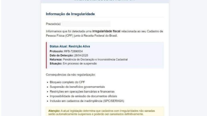 Os e-mails fraudulentos costumam conter alertas alarmistas, como “pendência identificada”, “CPF irregular” ou “irregularidade detectada”, seguidos por links que redirecionam o usuário a sites falsos. Essas páginas simulam o portal gov.br e pedem login e senha, que, quando inseridos, são capturados pelos golpistas. Algumas mensagens também exigem pagamento de supostas multas para desbloqueio do CPF ou prometem acelerar o recebimento da restituição do IR.