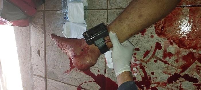Uma equipe do SAMU foi acionada, prestou os primeiros socorros no local e encaminhou a vítima ao Hospital João Paulo II com uma perfuração por projétil de arma de fogo no tornozelo.