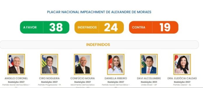 Subiu para 38 o número de senadores favoráveis ao impeachment do ministro Alexandre de Moraes. 24 senadores, entres eles, o senador Confúcio Moura (MDB), ainda não definiram o voto. 19 parlamentares são contrários a proposta. Confirma o posicionamento dos parlamentares no site votossenadores.com.br .