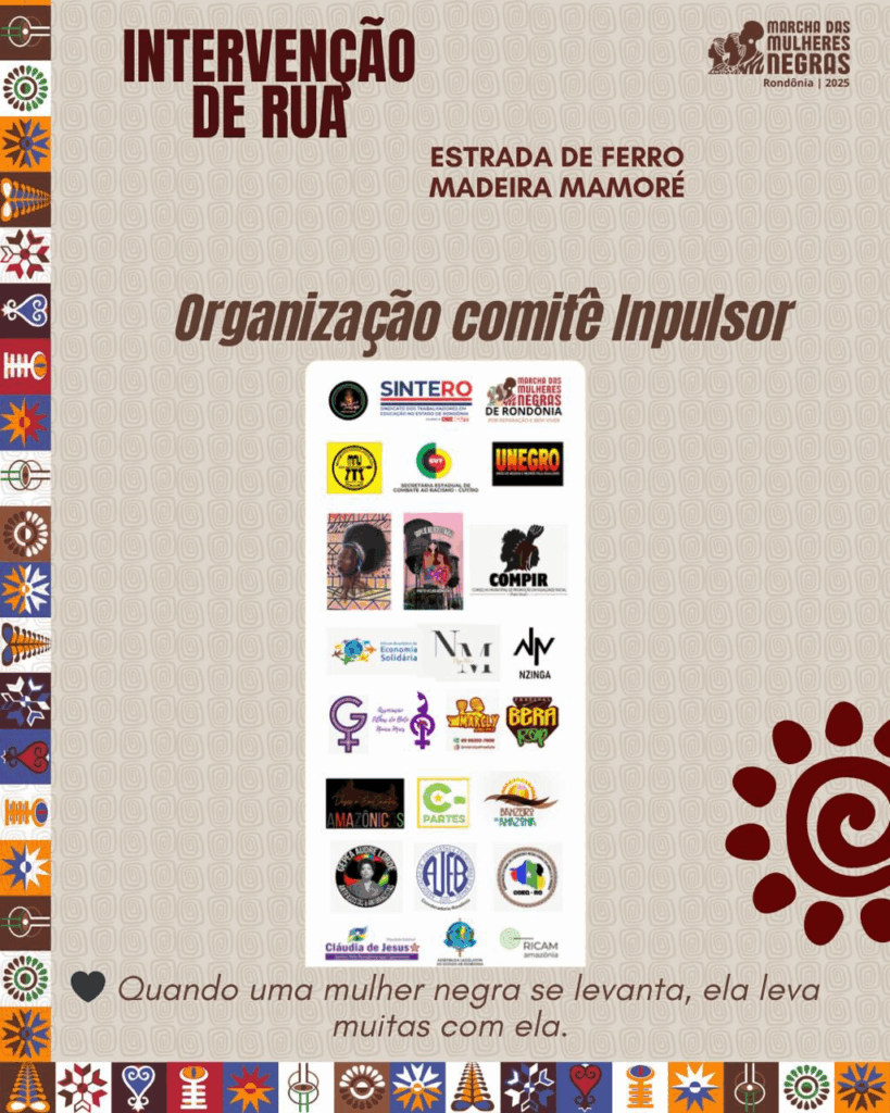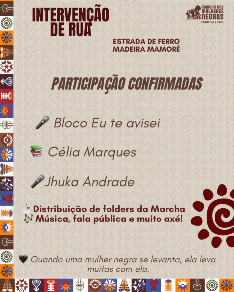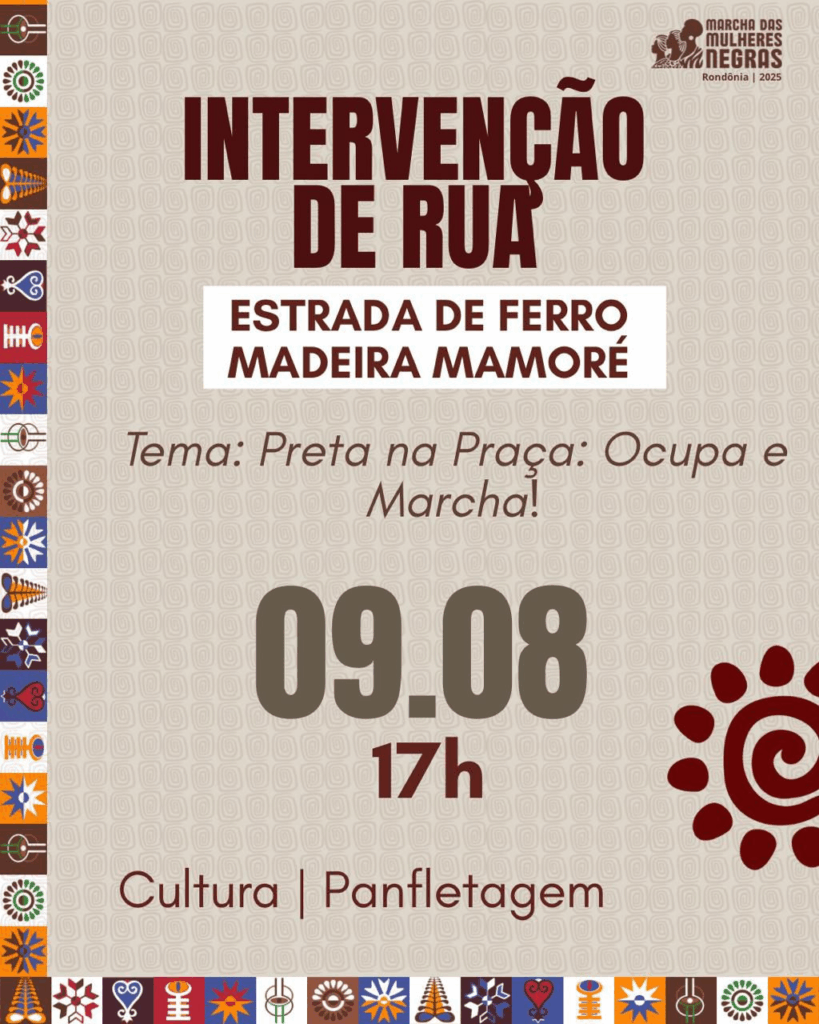 A ancestralidade negra estará em movimento neste sábado, 09 de agosto de 2025, às 17h, na Estrada de Ferro Madeira-Mamoré, em Porto Velho (RO). A Intervenção de Rua reunirá coletivos, instituições, artistas, grafiteiras, mulheres negras e apoiadores em uma ação cultural e política que integra o calendário preparatório da 1ª Marcha das Mulheres Negras de Rondônia.