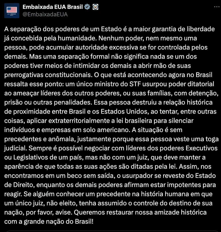 Na sexta (8/8), a Embaixada dos EUA já havia postado uma advertência direta a Moraes e seus aliados, afirmando que ele é “o principal arquiteto da censura e perseguição contra Bolsonaro e seus apoiadores” e que suas “flagrantes violações de direitos humanos” resultaram em sanções impostas pelo governo de Donald Trump com base na Lei Global Magnitsky.