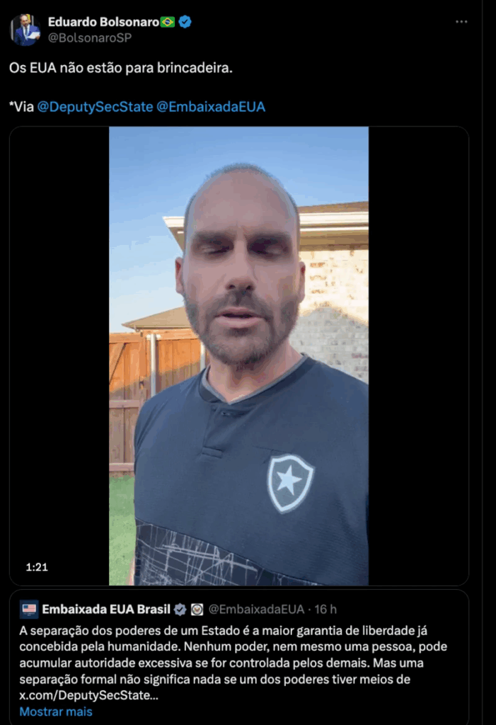A postagem também foi veiculada pelo filho de Jair Bolsonaro, Eduardo, junto de um vídeo, no X, com a legenda “Os EUA não estão para brincadeira.”