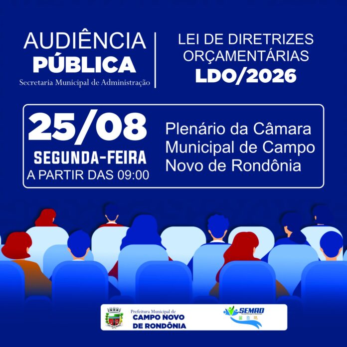 A prefeitura Municipal de Campo Novo de Rondônia, por meio da Secretaria Municipal de Administração (SEMAD), convida todos os cidadãos a participarem da Audiência Pública da Lei de Diretrizes Orçamentárias (LDO) para o exercício de 2026, que será realizada no dia 25 de agosto de 2025 (segunda-feira), a partir das 09h00, na Câmara Municipal.