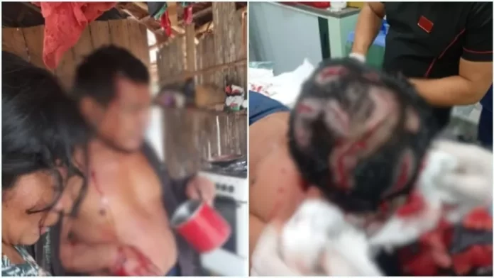 Um vídeo compartilhado em aplicativos de mensagem mostra o momento em que o homem recebe atendimento, com a cabeça bastante ferida.