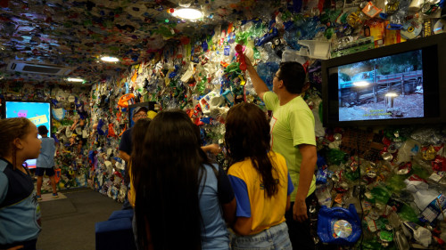 Entre os destaques, estão peças interativas que encantam crianças e adultos: uma balança que calcula o lixo produzido por pessoas ao longo da vida e um mapa digital de lixões e aterros. Já no espaço externo, esculturas criadas a partir de resíduos mostram que o descartado pode renascer em beleza e significado.
