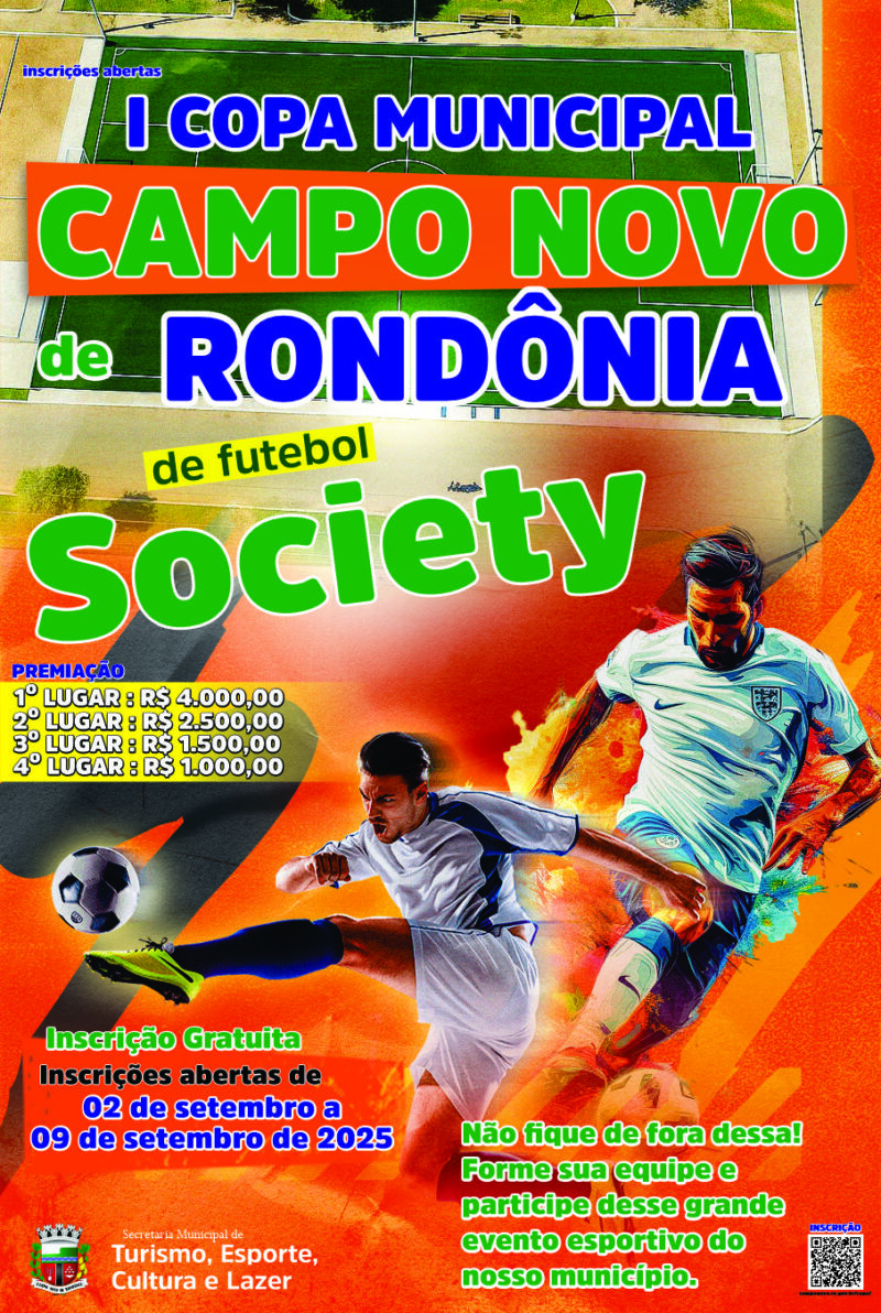 A Prefeitura de Campo Novo de Rondônia, por meio da Secretaria Municipal de Turismo, Esporte, Cultura e Lazer, anuncia a realização da I Copa Municipal de Futebol Society, um grande evento esportivo que promete reunir atletas, equipes e torcedores em uma celebração do esporte e da integração comunitária.