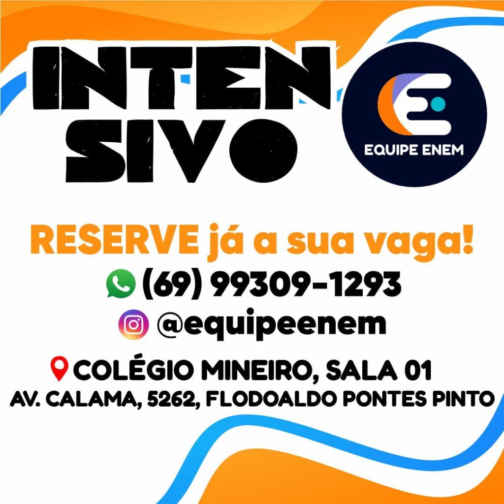 Estudantes interessados em participar de um Curso Pré Vestibular Intensivo Equipe Enem já podem se inscrever pelo fone 69 99309 1293, ir na sede do Colégio Mineiro, localizado na Av. Calama (sala 01) e também seguir a página do instagran @equipeenem. Os primeiros 30 alunos ganham bônus especial de 10% na inscrição. O curso terá início na próxima quarta-feira (10) e seguirá até o dia 14 de novembro.