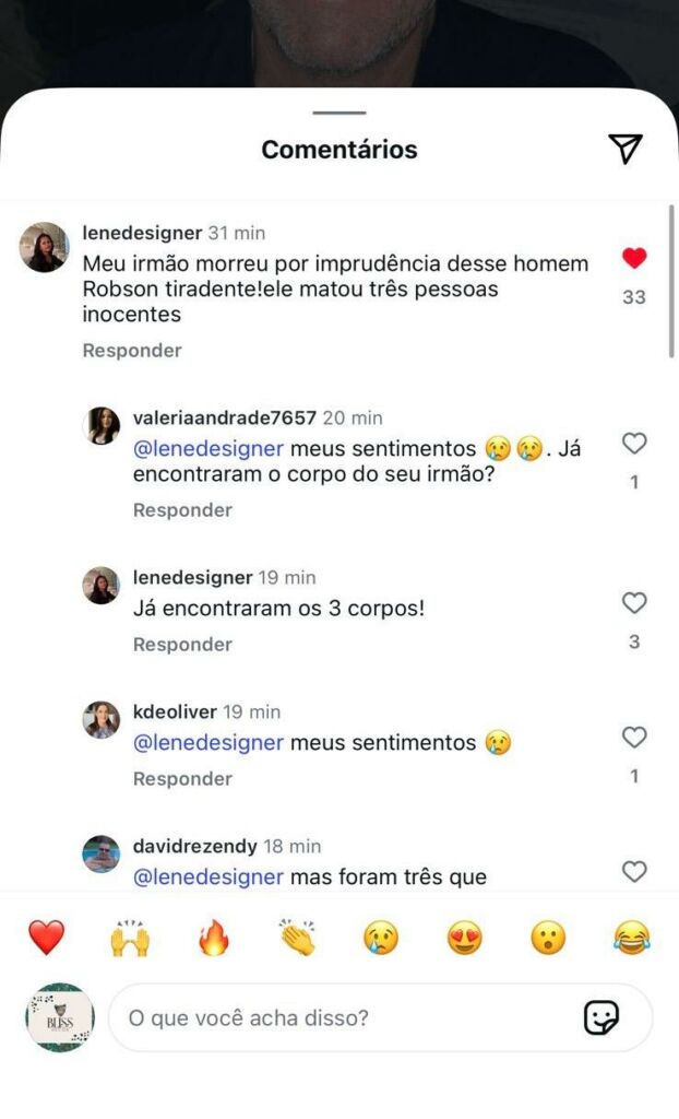 A irmã do piloteiro, Lene, também acusa Robson Tiradentes de ter provocado o acidente e causado a morte de seu irmão e das outras vítimas. “Meu irmão morreu por imprudência desse homem, Robson Tiradentes. Ele matou três pessoas inocentes”, comentou a mulher em um post nas redes sociais.