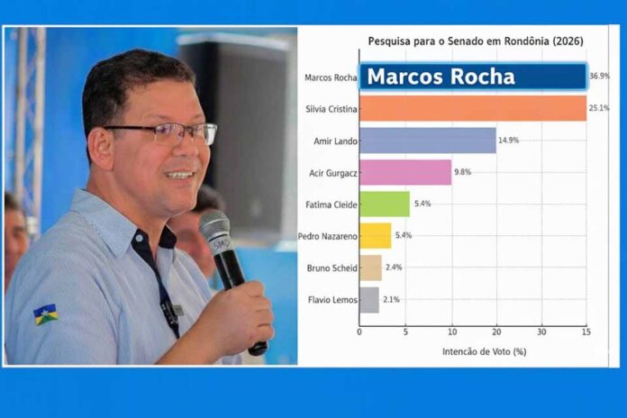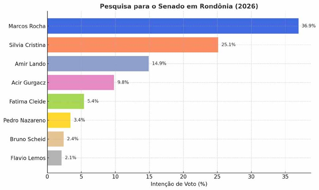 De acordo com os dados consolidados, Marcos Rocha (UB) aparece com 36,9% das intenções de voto, seguido por Silvia Cristina (UP), que registra 25,1%. Em terceiro lugar está Amir Lando (MDB), com 14,9%. Na quarta posição surge Acir Gurgacz (PDT), que soma 9,8%.