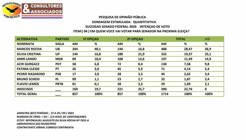 Os números da primeira pesquisa de intenção de voto para o Senado em 2026 em Rondônia foram divulgados nesta sexta-feira (02) pelo Jornal Correio Continental. O estudo, conduzido pelo Instituto Phoenix Consultores & Associados, ouviu 857 eleitores entre os dias 27 e 29 de setembro de 2025, em Porto Velho e Candeias do Jamari.