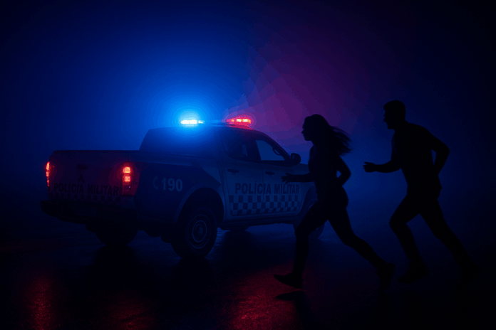 Quando chegaram ao local, os policiais encontraram duas testemunhas que relataram ter visto o suspeito, identificado pelas iniciais P.S., de 21 anos, perseguindo a esposa, K.M., também de 21 anos, com a arma em mãos. As testemunhas contaram ainda que tentaram intervir, mas o homem reagiu de forma agressiva e tentou atacá-las antes de fugir.
