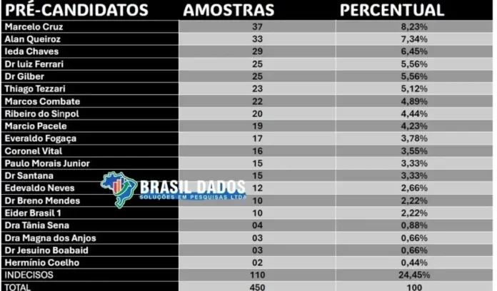 Segundo os números, se a eleição fosse hoje, Marcelo Cruz aparece na dianteira com 8,22% das intenções de voto, seguido de Alan Queiroz (7,33%) e Ieda Chaves (6,44%). Logo atrás, Dr. Luiz Ferrari e Dr. Gilber surgem empatados, ambos com 5,55%.