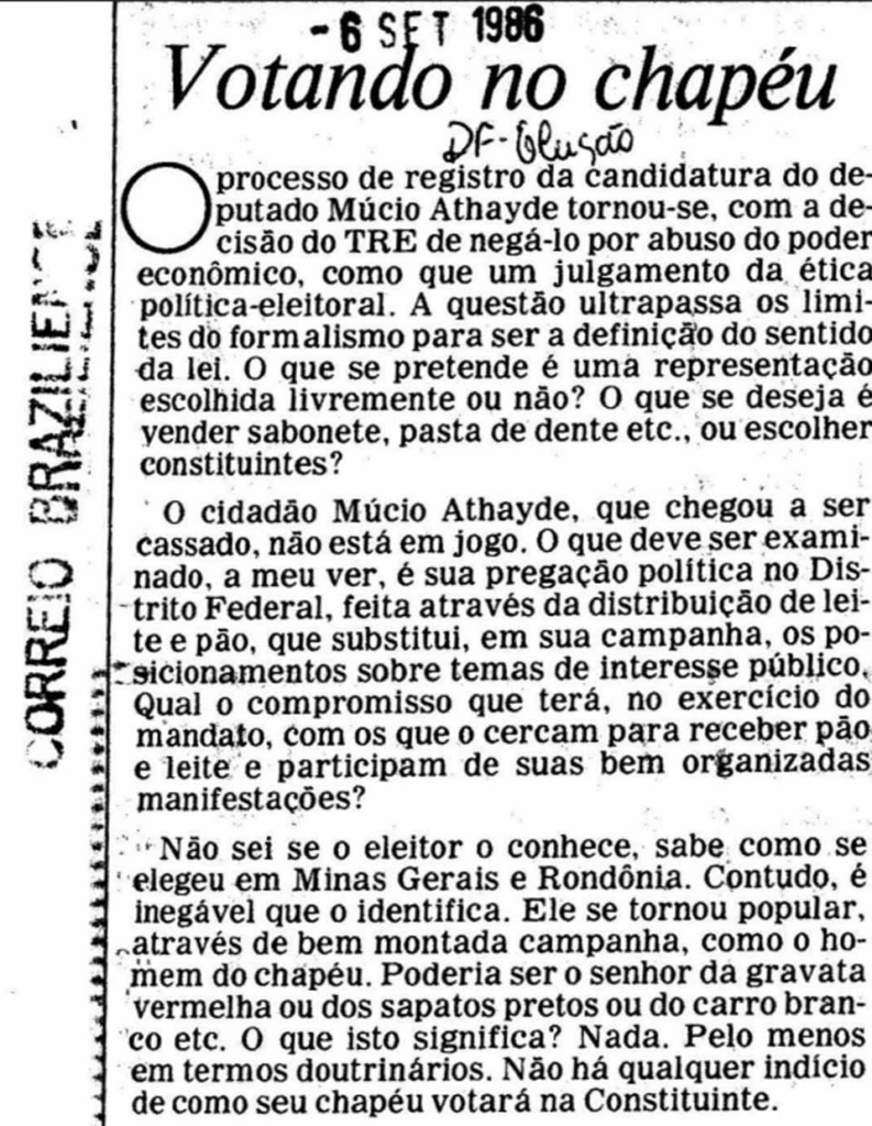 Como relembrou o jornalista João Emílio Falcão em artigo publicado no Correio Braziliense de 6 de setembro de 1986, a trajetória de Múcio Athayde ultrapassava o mero formalismo eleitoral. Falcão descreveu a candidatura do “Homem do Chapéu” como um exemplo de campanha ancorada na compra de consciências: “Substituiu o debate por distribuição de pão e leite”, escreveu. “Usou a pobreza do povo para obter votos que deveriam ser dados por motivos políticos”.