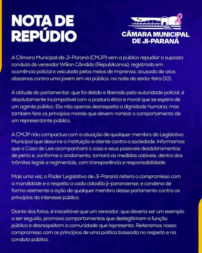 A Câmara Municipal de Ji-Paraná divulgou posicionamento público em que repudia o episódio e considera a atitude atribuída ao parlamentar “absolutamente incompatível com a postura ética e moral que se espera de um agente público”. A Casa informou que acompanhará o caso e adotará as medidas cabíveis “dentro dos trâmites legais e regimentais”.