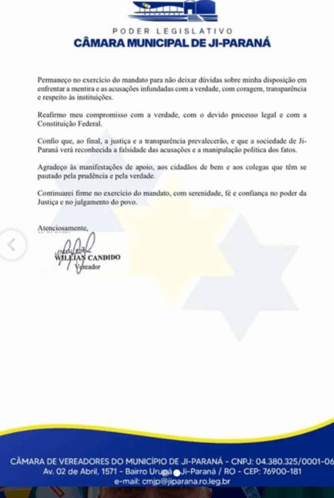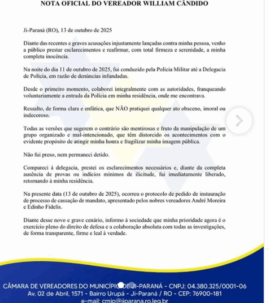 Porto Velho, RO — O vereador William Cândido (Republicanos), de Ji-Paraná (RO), divulgou uma nota oficial na última segunda-feira (13) negando as acusações que levaram seu nome a ser notícia em portais de abrangência nacional, como o UOL. O caso foi registrado no sábado (11), quando ele foi conduzido pela Polícia Militar à delegacia após denúncia de suposto ato obsceno em via pública.