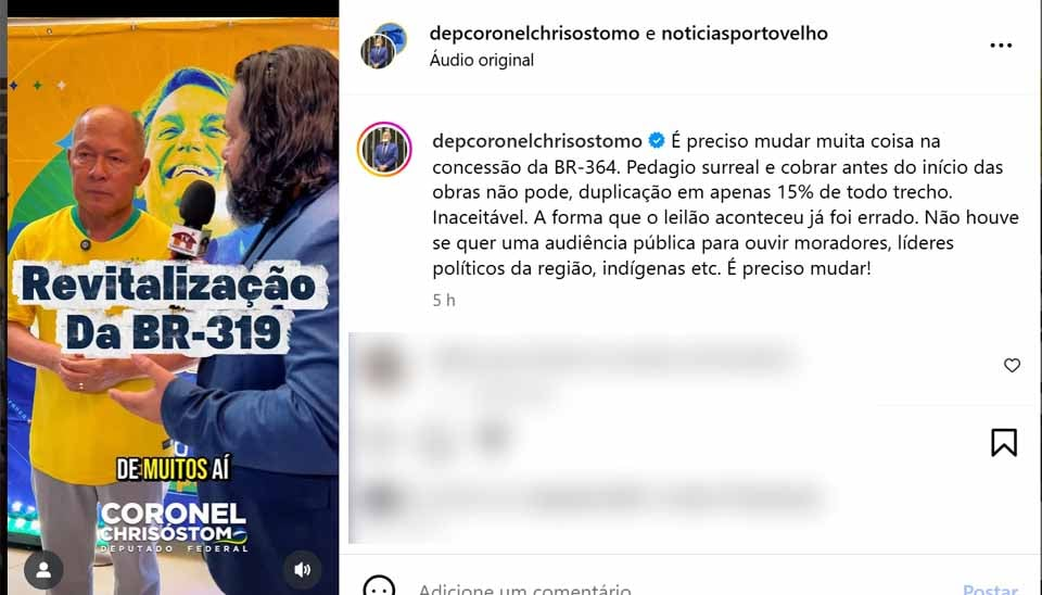 O deputado federal Coronel Chrisóstomo (PL) deu uma entrevista sobre a BR-319, mas, ao comentar o mesmo tema em sua conta no Instagram, trocou a rodovia por outra. Enquanto na gravação o parlamentar afirma conhecer a 319 “desde quando estavam construindo ela”, no post publicado horas depois ele escreve sobre a concessão da BR-364, citando pedágios, duplicação e o leilão do trecho concedido.