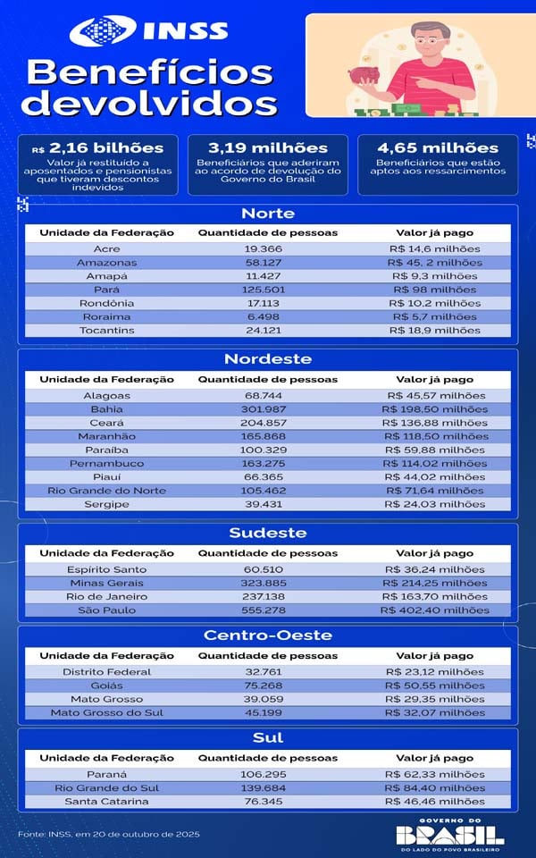 NACIONAL – Nesta semana, o Governo do Brasil atingiu a marca de R$ 2,1 bilhões pagos no acordo de ressarcimento a 3,1 milhões de aposentados e pensionistas. O pagamento é feito diretamente na conta do benefício, com correção pela inflação (IPCA), sem necessidade de ação judicial.