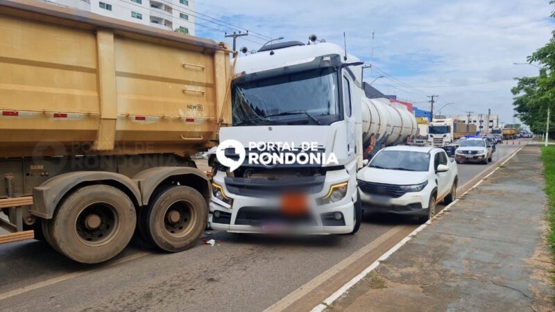 Um acidente envolvendo duas carretas e uma carro Fiat Strada foi registrado na manhã de sexta-feira (24/10), na avenida Jorge Teixeira, em Porto Velho. Apesar do grave risco devido a uma das carretas estar carregada com combustíveis, felizmente não houve feridos.