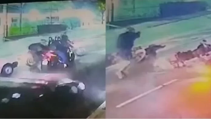 Os três assaltantes estavam em duas motocicletas e abordaram a vítima, que também pilotava uma moto, anunciando o assalto.