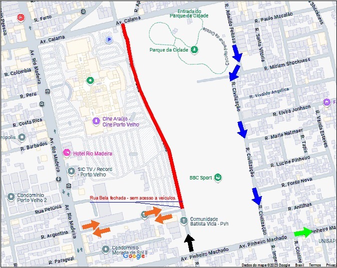 De acordo com a Semtran, a Rua Bela ficará parcialmente bloqueada aos fins de semana, sextas, sábados e domingos, no trecho entre a Rua Argentina e a Avenida Calama. O acesso será permitido apenas entre a Rua Pinheiro Machado e a Rua Argentina. O objetivo é manter a segurança de pedestres e organizar o fluxo intenso de veículos esperado para os dias de evento.