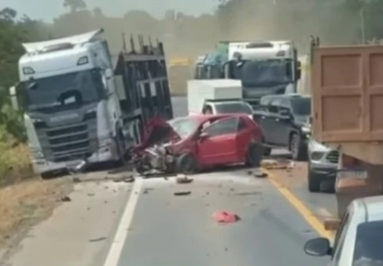 Um acidente grave foi registrado no início da tarde desta quarta-feira (19), no km 412 da BR-364, em Jaru, deixando um Fiat Punto completamente destruído após uma colisão envolvendo dois veículos de passeio e uma carreta-cegonha. A batida ocorreu no sentido decrescente da rodovia.