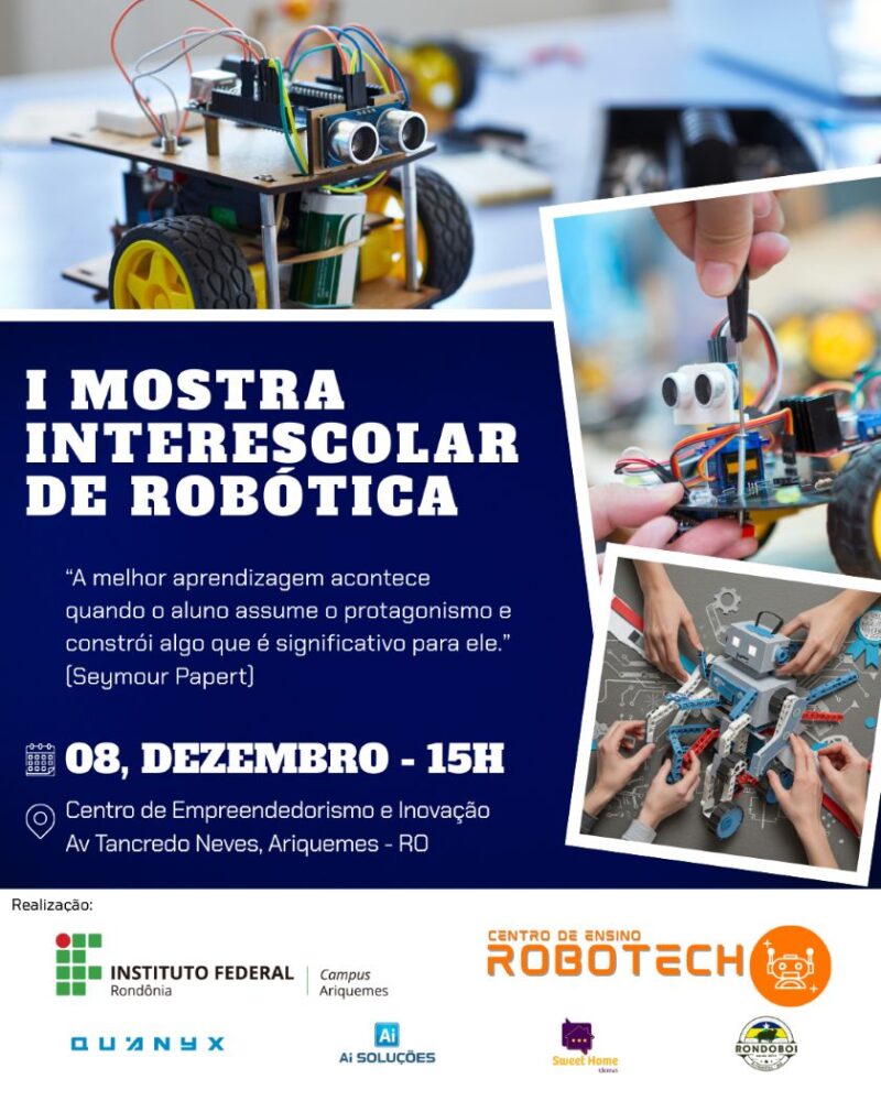 O Instituto Federal de Educação, Ciência e Tecnologia de Rondônia (IFRO), Campus Ariquemes, realizará a I Mostra Interescolar de Robótica de Ariquemes. O evento é organizado pelo Departamento de Extensão (Depex) em parceria com o Centro de Ensino Robotech. A Mostra ocorrerá no dia 8 de dezembro (sábado), às 15 horas, no Centro de Empreendedorismo e Inovação (CEI), na Avenida Tancredo Neves, nº 3.960, Setor Institucional (localizado entre o Senai e o Sesc de Ariquemes).