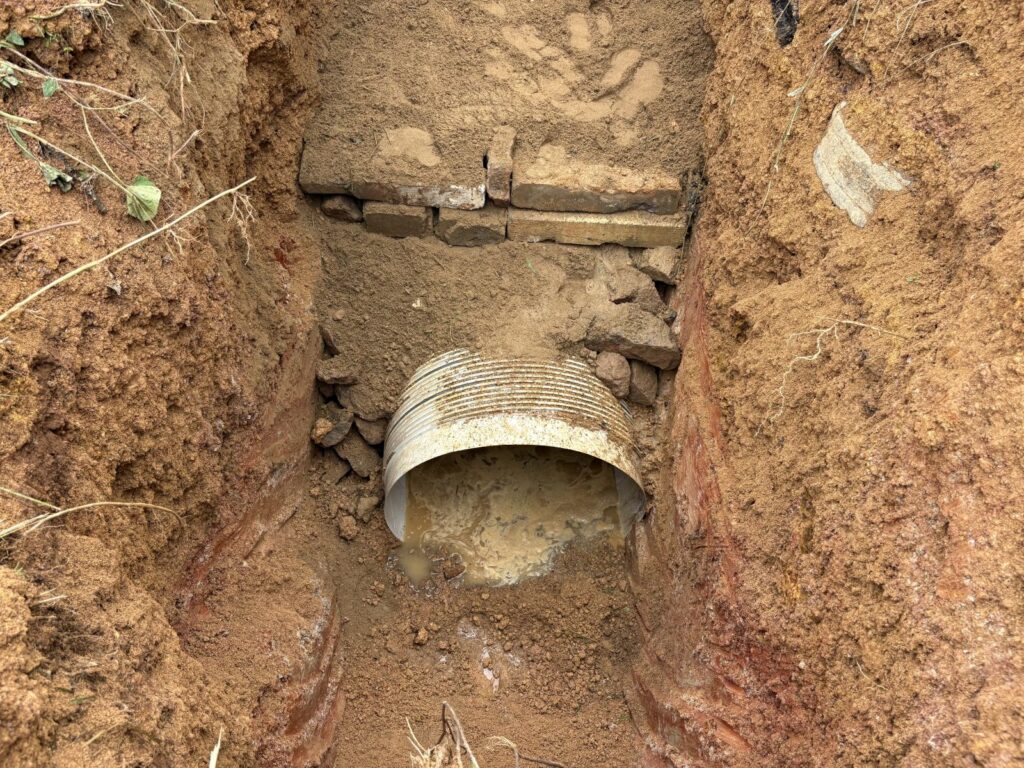 No local, já havia um tubo instalado anteriormente. No entanto, devido à intensidade da correnteza e ao fato de esse tubo estar cerca de 50 centímetros acima do nível adequado, a passagem da água ficava comprometida.