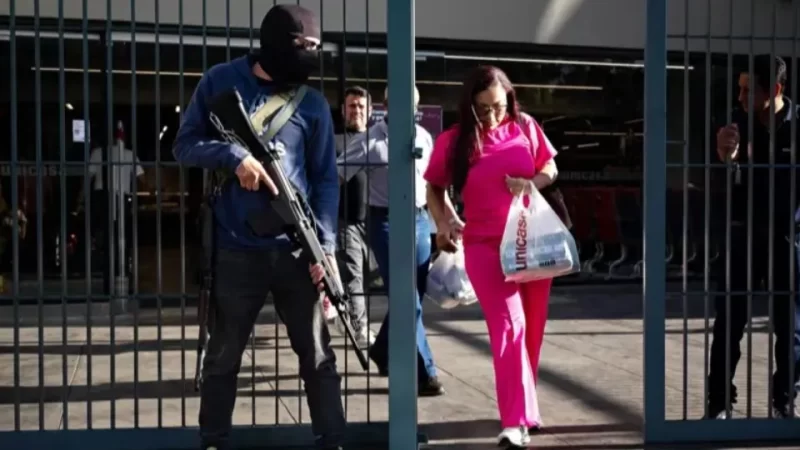 Membro de um grupo armado civil monitora entrada de um supermercado em Caracas neste domingo (04/01)