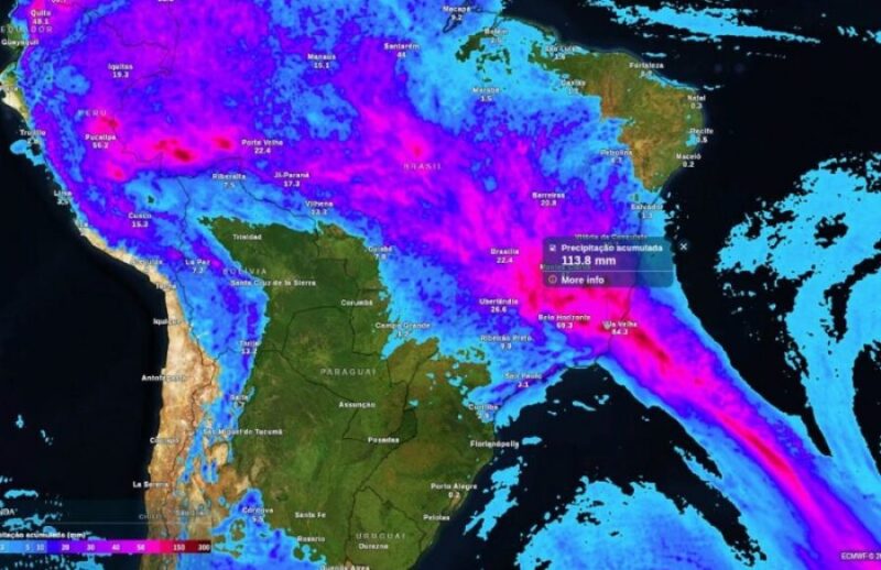 A previsão meteorológica, segundo o informativo do Instituto Nacional de Meteorologia (Inmet), indica que os principais eventos de chuva no país, entre os dias 19 e 26 de janeiro de 2026, estão ligados à passagem de sistemas transientes próximos das regiões Sul e Sudeste, que ao se acoplarem a um canal de umidade contribuem para a configuração de um novo episódio da Zona de Convergência do Atlântico Sul (ZCAS). Esse cenário favorece a ocorrência de tempestades e chuvas recorrentes em parte do território nacional, principalmente entre o Norte, Centro-Oeste e Sudeste, com potencial para acumulados elevados ao longo da semana.