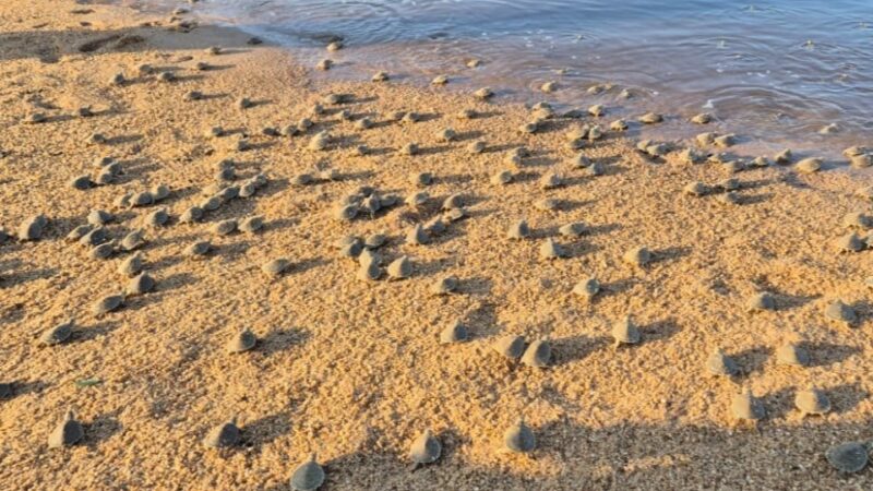 Voluntários da Ecovalle, em parceria com o Ibama, estão resgatando tartaruguinhas nos ninhos, com o apoio de moradores, pescadores e turistas. Nesta temporada, mais de 150 mil filhotes foram soltos, mas o atraso na desova e a cheia inesperada estão dificultando a sobrevivência.