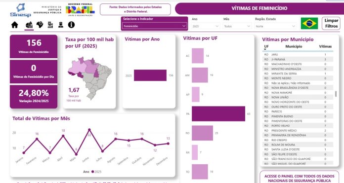 Os estados do Pará e Rondônia lideram, na região Norte, casos de feminicídios, conforme dados divulgados pelo Ministério da Justiça e Segurança Pública. Em Rondônia, os municípios com mais casos registrados foram Porto Velho e Ji-Paraná. Em terceiro lugar está o município de Buritis. Veja o mapa de casos de feminicídios.
