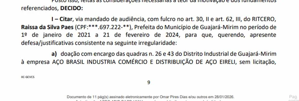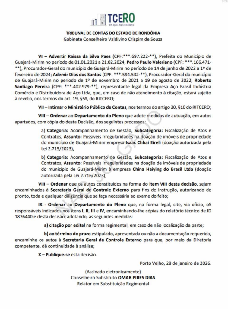 O Tribunal de Contas do Estado de Rondônia (TCE-RO) abriu uma investigação sobre a doação de imóveis públicos para a empresa Aço Brasil Indústria Comércio e Distribuidora de Aço Ltda., em Guajará-Mirim, e determinou que a ex-prefeita Raíssa da Silva Paes, conhecida como Raíssa Bento, e outros envolvidos se manifestem sobre possíveis irregularidades no processo. A decisão foi assinada no dia 28 de janeiro de 2026 e refere-se a um processo iniciado a partir de representação do Ministério Público de Contas (MPC).