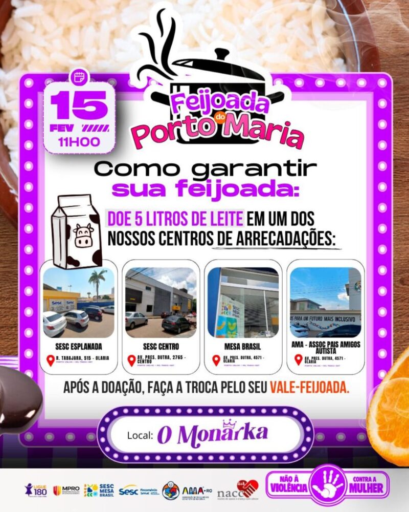 O Sistema Fecomércio Rondônia, por meio do Sesc Mesa Brasil reafirmando seu compromisso com o desenvolvimento social e cultural do estado, oficializou uma parceria estratégica com o Bloco Porto Maria para a realização de sua tradicional Feijoada Solidária. O evento, que acontece no dia 15 de fevereiro, no espaço O Monarka, une a festividade carnavalesca ao impacto social promovido pelo Sesc Mesa Brasil.