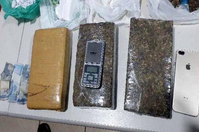 Durante a ação, uma mulher que se apresentou como companheira do suspeito afirmou residir com ele no apartamento. Diante da situação de flagrância e da confirmação do mandado de prisão, os policiais realizaram buscas no imóvel. No local, foram encontrados aproximadamente 3,394 quilos de substância semelhante à maconha, distribuídos em tabletes e porções, além de três sacolas contendo substância aparentando ser cocaína.