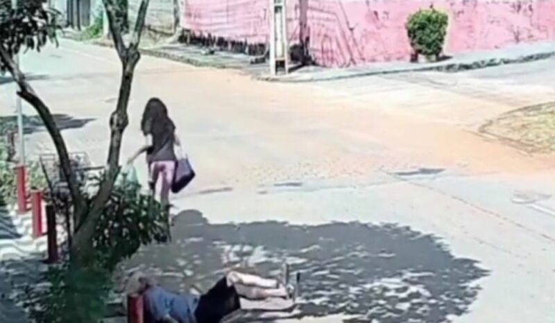 . As imagens mostram o momento em que a suspeita, identificada pela Polícia Militar como Izabel Cristina Passos da Silva, de 46 anos, pegou a carteira no bolso da camisa do idoso, que se desequilibrou e caiu no asfalto ao tentar impedi-la. Enquanto ele gritava por socorro, a mulher fugiu.