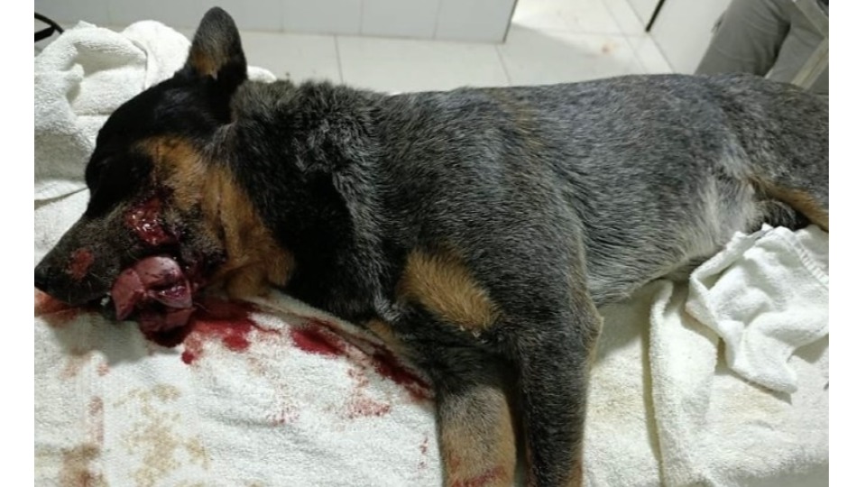 O cachorro, da raça Blue Heeler (boiadeiro australiano) foi resgatado por um médico veterinário e submetido a duas horas de cirurgia para a reconstrução da língua, dentre outros procedimentos. Apesar da gravidade dos ferimentos, ele já está a salvo e não corre risco de morte.