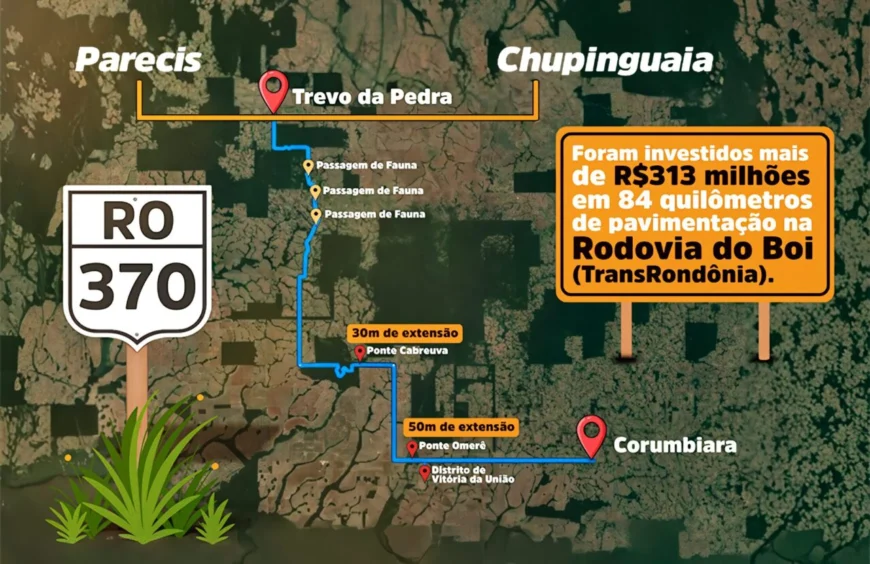 - RO-370 (Rodovia do Boi / TransRondônia): Pavimentação de 84 km entre Corumbiara e o Trevo da Pedra. Inclui asfalto de alta resistência (CBUQ) e duas pontes de concreto estratégicas: