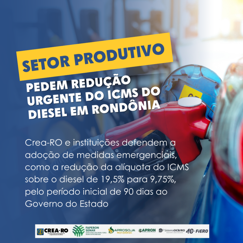 A iniciativa reúne instituições como a Federação da Agricultura e Pecuária do Estado de Rondônia (Faperon), Aprosoja-RO, Apron, OCB-RO e Fiero, que encaminharam um ofício ao Governo do Estado pedindo a redução temporária da alíquota do ICMS sobre o óleo diesel.