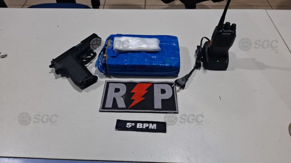 Entre os objetos dispensados, foram localizados um simulacro de arma de fogo (pistola de cor preta) e um rádio transceptor HT da marca Baofeng com carregador – itens comumente associados à logística do tráfico.