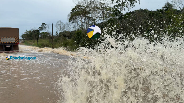 Um trecho da BR-364, em Jaru, a cerca de 70 quilômetros de Ariquemes, está sendo tomado pelas águas em decorrência de fortes chuvas na região, que causaram transbordamento de rios.